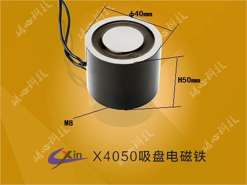 X4050吸盤電磁鐵/微型電磁鐵磁心科技批量生產的一款微型吸盤式電磁鐵,產品的直徑40mm,高度50mm,吸力可達到40KG以上被市場廣泛運用。
