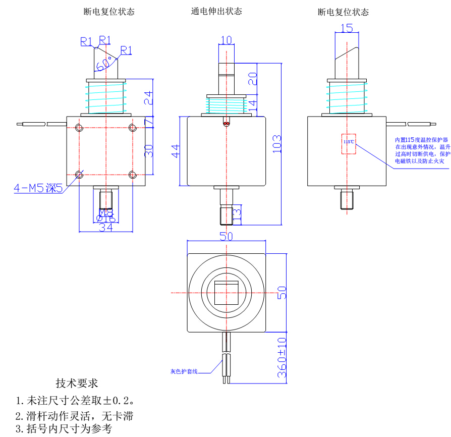 一、高精密門鎖推拉式電磁鐵尺寸圖: