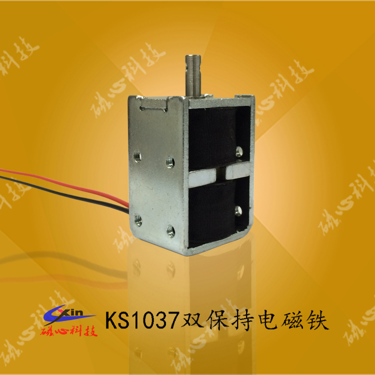 KS1040雙保持電磁鐵屬于微型推拉式電磁鐵,具有雙保持功能,產品可以在沒通電的情況下在永磁鐵的作用下保持在一個位置,保持力的大小可根據客戶的要求設定。電磁鐵廠家--磁心